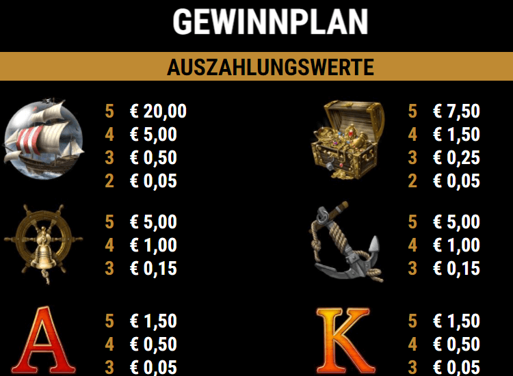 Reguläre Gewinne entstehen für Gewinnkombinationen aus zwei bis fünf gleichen, nebeneinander aufgereihten Symbolen auf aktivierten Gewinnlinien. Es gibt sechs geringwertige Zeichen, dargestellt von Buchstaben und Zahlen, sowie vier hochwertige Symbole, dargestellt von einem Anker, einem Steuerrad, dem goldenen Schatz und dem Piratenschiff.
